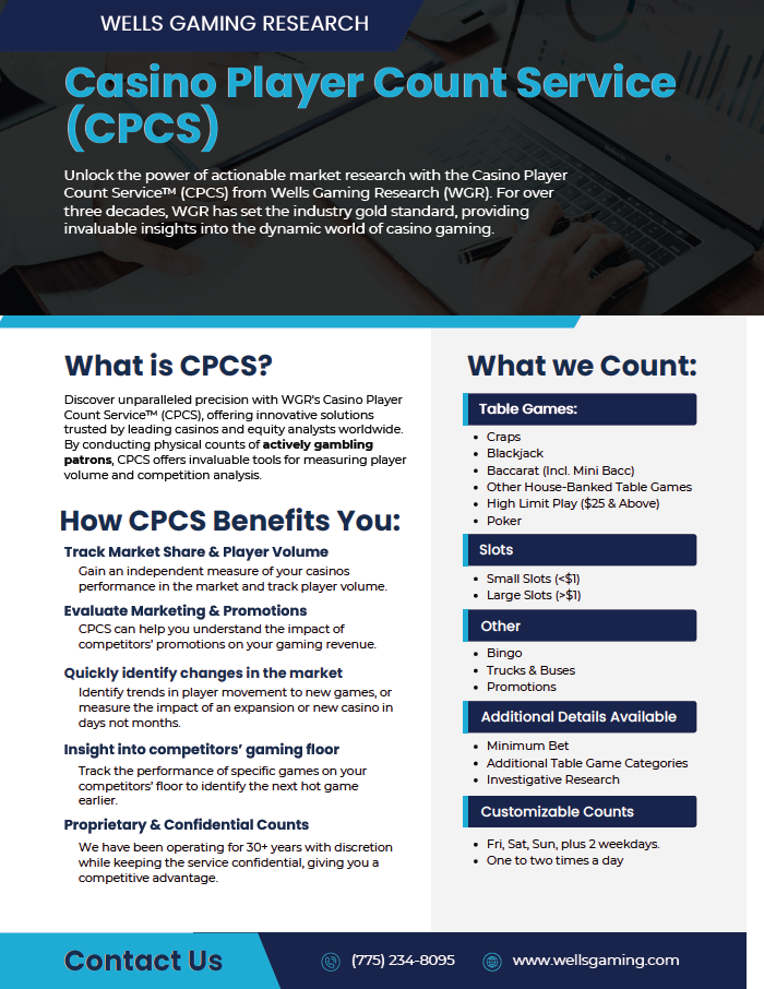 Casino Player Count Service (CPCS)™Real gambler headcounts at 175+ casinos every day. Get a sample of cpcs WGR's Casino Player Count Service™ Click to view CPCS flyer